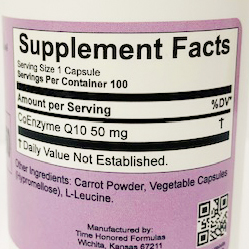 Coenzyme Q10, or CoQ10, is a substance that is present in almost all cells of the body. The best sources of CoQ10 are whole grains, oily fish and organ meats, such as beef heart, liver or kidney, there is a man-made form of CoQ10 available as a supplement, but in Time Honored Formulas we use the vegetable/whole grain form naturally fermented ubidecarenone carefully presented in Vegetable Capsules of carrot powder in order to ease swallowing. Do not use CoQ10 supplements to replace conventional medical care, or as a reason to postpone seeing a health care provider about a medical problem.