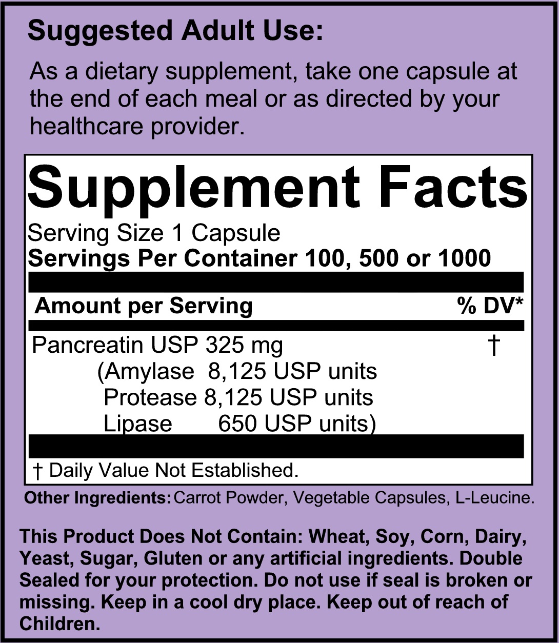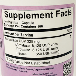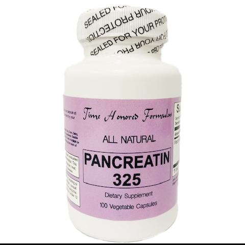 The Pancreatin 325 from Time Honored Formulas, is carefully manufactured in Vegetable Capsules; each capsule of carrot powder contains a balanced 325mg mixture of amylase, lipase, and protease. The source of this pancreatin is Porcine. You should not take Pancreatin if you are allergic to swine (pork) proteins.